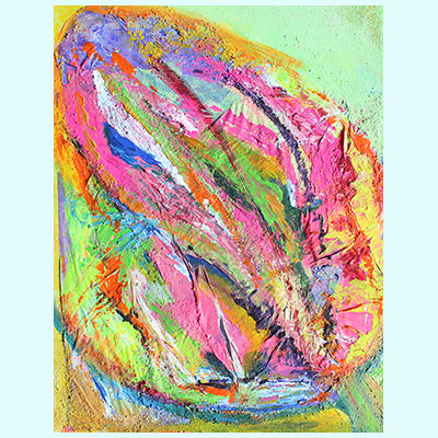 Starting with a blank canvas, and with no real plan or expectation of results, I quickly apply paint, and experiment. I get my inspiration as the piece develops and by using a variety of mediums and textures, which all helps to add interest to the piece.